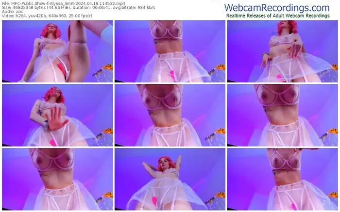 There are a total of 2,624 recordings (1,657 hours) of Alyssa_Smit from MyFreeCams, MV_Live and Stripchat available below.