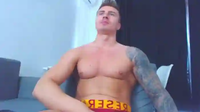 His birthday is July 18th 1997 making him 28 years old, and the average age of models on Flirt4Free is 25—making him one of the older models. His height is 183cm, and his weight is 83kg. He identifies his ethnicity as caucasian. He has a shaved pubic hair, muscular body with blue eyes and short blonde hair.His body art includes tattoo(s).