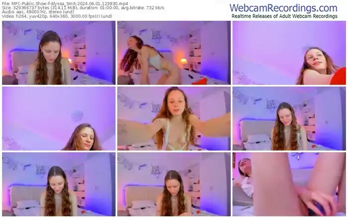 There are a total of 2,618 recordings (1,653 hours) of Alyssa_Smit from MyFreeCams, MV_Live and Stripchat available below.