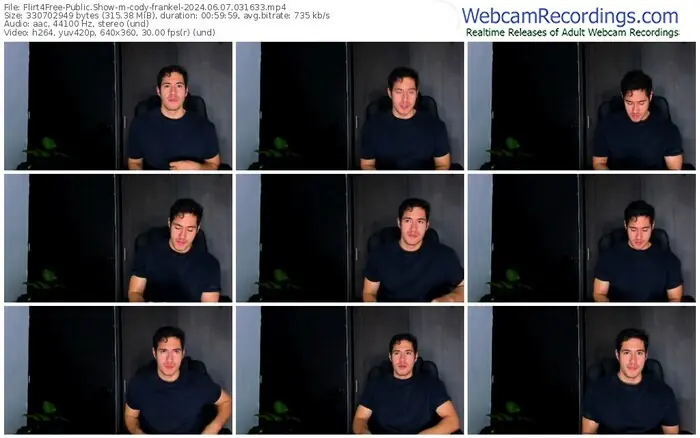 There are a total of 228 recordings (158 hours) of cody-frankel from Flirt4Free available below.