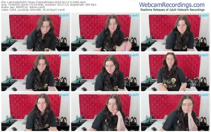 There are a total of 5 recordings (2 hours) of hannahtease from CamSoda available below.