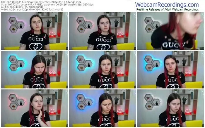 There are a total of 1,093 recordings (543 hours) of molly-travis from Flirt4Free available below.