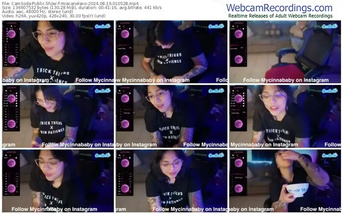 There are a total of 281 recordings (205 hours) of miacanelaxo from CamSoda and Bongacams available below.