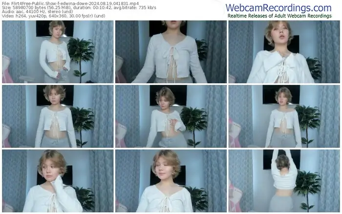 There are a total of 153 recordings (73 hours) of edwina-dowe from Flirt4Free available below.
