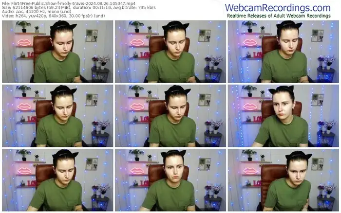 There are a total of 1,093 recordings (543 hours) of molly-travis from Flirt4Free available below.