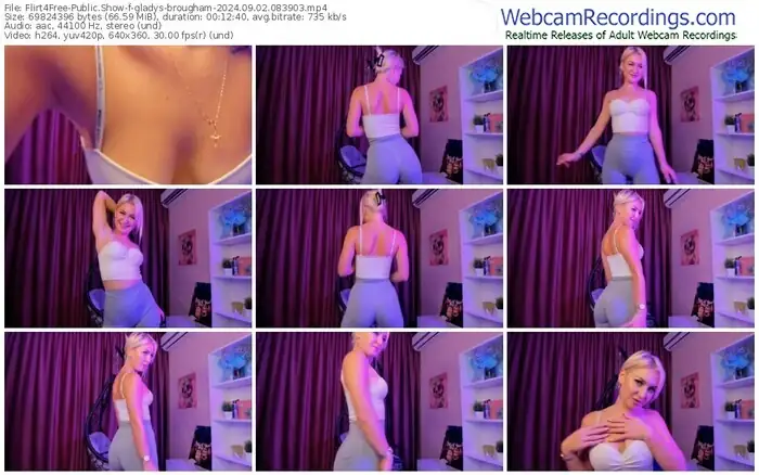 There are a total of 22 recordings (15 hours) of gladys-brougham from Flirt4Free available below.