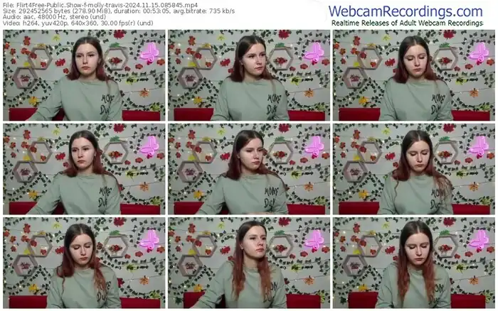 There are a total of 1,093 recordings (543 hours) of molly-travis from Flirt4Free available below.