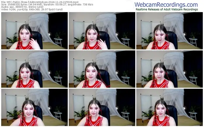 There are a total of 2,001 recordings (691 hours) of AdmireMyEyes from MyFreeCams available below.