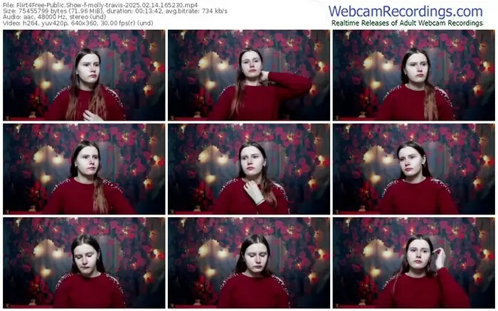 There are a total of 1,093 recordings (543 hours) of molly-travis from Flirt4Free available below.