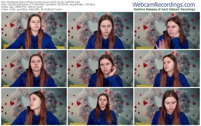 There are a total of 1,093 recordings (543 hours) of molly-travis from Flirt4Free available below.