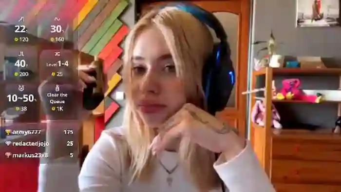 Her birthday is March 25th 2006 making her 19 years old, and the average age of models on Flirt4Free is 25—making her one of the younger models. Her height is 160cm, and her weight is 48kg. She identifies her ethnicity as mixed. She has a shaved pubic hair, and c cup breasts on a slim body with blue eyes and shoulder blonde hair.Her body art includes piercings, tattoo(s).