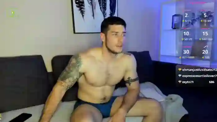 His birthday is April 21st 1997 making him 28 years old, and the average age of models on Flirt4Free is 25—making him one of the older models. His height is 180cm, and his weight is 85kg. He identifies his ethnicity as caucasian. He has a trimmed pubic hair, muscular body with green eyes and short black hair.His body art includes tattoo(s).
