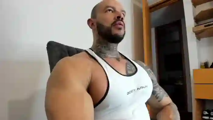 His birthday is July 12th 1994 making him 31 years old, and the average age of models on Flirt4Free is 25—making him one of the older models. His height is 185cm, and his weight is 113kg. He identifies his ethnicity as mixed. He has a shaved pubic hair, muscular body with brown eyes and bald bald hair.His body art includes tattoo(s).