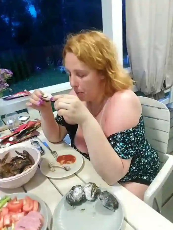 She identifies her ethnicity as white. She has a large body with blue eyes.