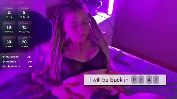 Her birthday is August 7th 2001 making her 24 years old, and the average age of models on Flirt4Free is 25—making her one of the younger models. Her height is 169cm, and her weight is 63kg. She identifies her ethnicity as caucasian. She has a shaved pubic hair, and b cup breasts on a curvy body with blue eyes and very long brown hair.Her body art includes piercings, tattoo(s).