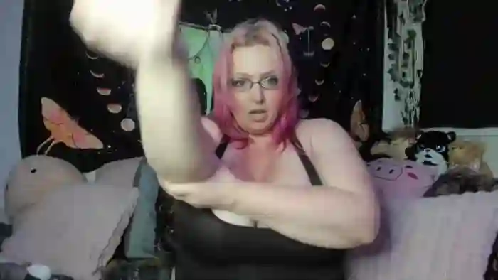 She is 45 years old, and the average age of models on Streamate is 30—making her one of the older models. Her height is 5'2, and her weight is 225 lbs. She identifies her ethnicity as white. She has a k plus cup size breasts, hairy pubic hair on a bbw body with blue eyes and dyed hair.Her body art includes tattoos, piercings.