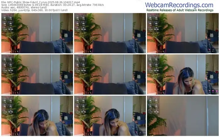 There are a total of 2,747 recordings (1,373 hours) of Avril_Cyrus from MyFreeCams, ePlay and Stripchat available below.