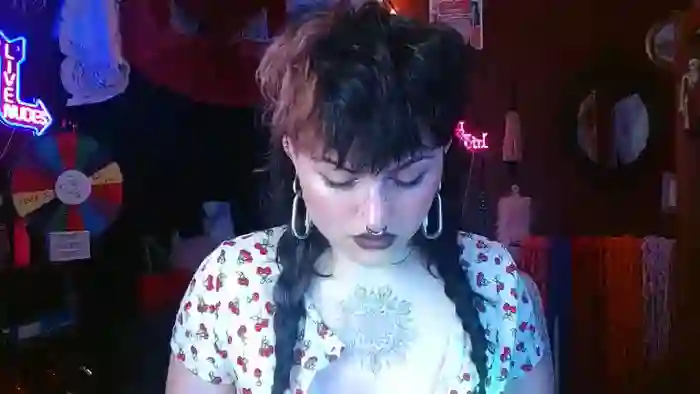 She is 23 years old, and the average age of models on Streamate is 30—making her one of the younger models. Her height is 5'8, and her weight is 155 lbs. She identifies her ethnicity as white. She has a c cup size breasts, hairy pubic hair on a curvaceous body with hazel eyes and dyed hair.Her body art includes tattoos, piercings.