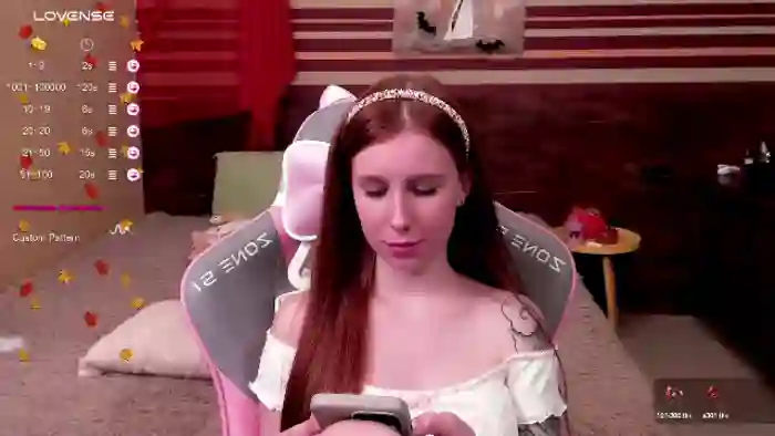 Her birthday is March 27th 2003 making her 22 years old, and the average age of models on Flirt4Free is 25—making her one of the younger models. Her height is 162cm, and her weight is 48kg. She identifies her ethnicity as caucasian. She has a shaved pubic hair, and c cup breasts on a slim body with blue eyes and long red hair.Her body art includes piercings, tattoo(s), fake breasts.