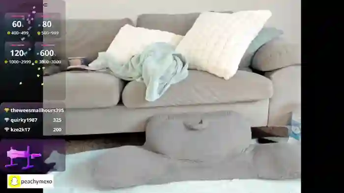 peachespanties123 is a female webcam model from Chaturbate.