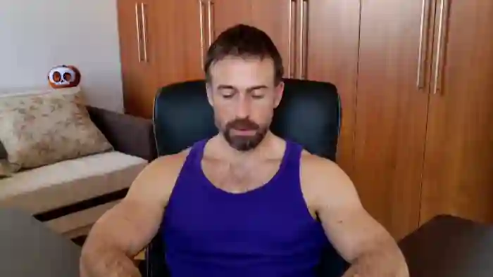 His birthday is June 30th 1992 making him 33 years old, and the average age of models on Flirt4Free is 25—making him one of the older models. His height is 187cm, and his weight is 89kg. He identifies his ethnicity as caucasian. He has a trimmed pubic hair, muscular body with blue eyes and short brown hair.