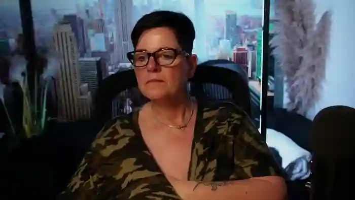 She is 54 years old, and the average age of models on Streamate is 30—making her one of the older models. Her height is 5'7, and her weight is 209 lbs. She identifies her ethnicity as white. She has a d cup size breasts, hairy pubic hair on a bbw body with blue eyes and black hair.Her body art includes tattoos.