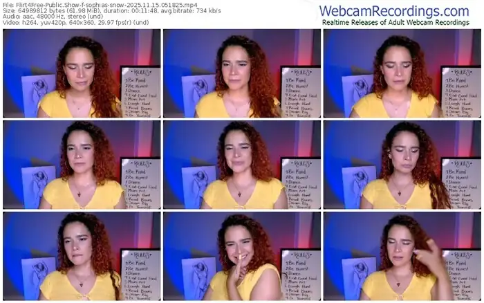 There are a total of 320 recordings (189 hours) of sophias-snow from Flirt4Free available below.