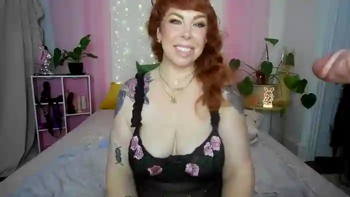 She is 41 years old, and the average age of models on Streamate is 30—making her one of the older models. Her height is 5'8, and her weight is 220 lbs. She identifies her ethnicity as white. She has a ddd/f cup size breasts, bald pubic hair on a bbw body with blue eyes and red hair.Her body art includes tattoos, piercings.