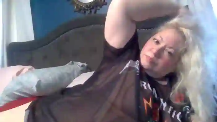She is 52 years old, and the average age of models on Streamate is 30—making her one of the older models. Her height is 5'4, and her weight is 250 lbs. She identifies her ethnicity as white. She has a dd/e cup size breasts, bald pubic hair on a curvaceous body with blue eyes and blond hair.Her body art includes tattoos, piercings.