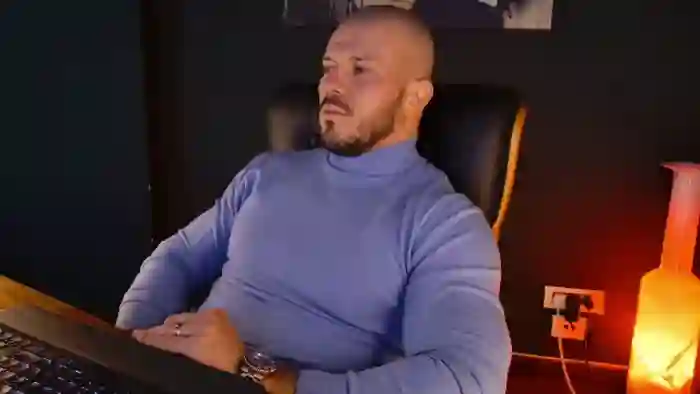 His birthday is May 18th 1987 making him 38 years old, and the average age of models on Flirt4Free is 25—making him one of the older models. His height is 188cm, and his weight is 108kg. He identifies his ethnicity as mixed. He has a shaved pubic hair, muscular body with green eyes and bald black hair.