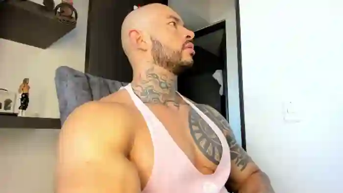 His birthday is July 12th 1994 making him 31 years old, and the average age of models on Flirt4Free is 25—making him one of the older models. His height is 185cm, and his weight is 113kg. He identifies his ethnicity as mixed. He has a shaved pubic hair, muscular body with brown eyes and bald bald hair.His body art includes tattoo(s).
