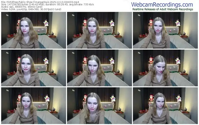 There are a total of 3,195 recordings (1,226 hours) of margarita-k from Flirt4Free available below.