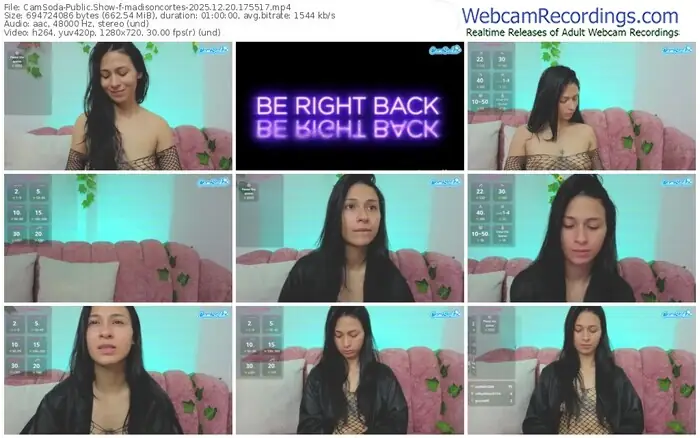 There are a total of 2 recordings (2 hours) of madisoncortes from CamSoda available below.