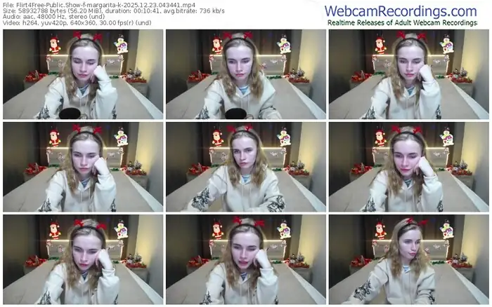 There are a total of 3,290 recordings (1,264 hours) of margarita-k from Flirt4Free available below.
