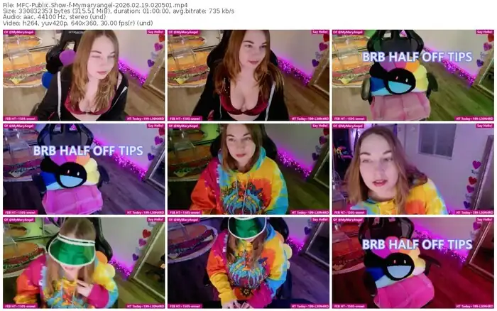 There are a total of 612 recordings (290 hours) of Mymaryangel from MyFreeCams and Chaturbate available below.